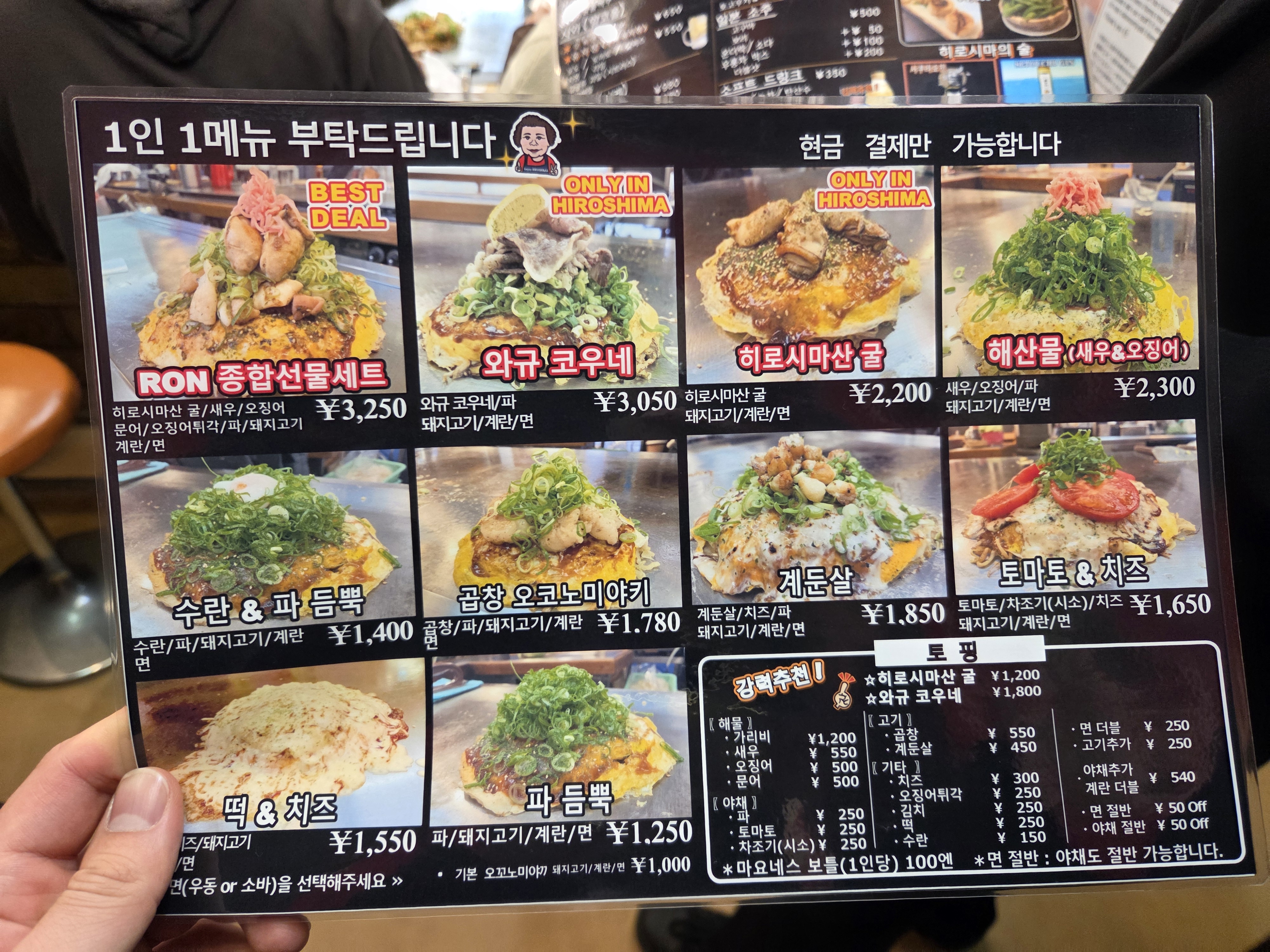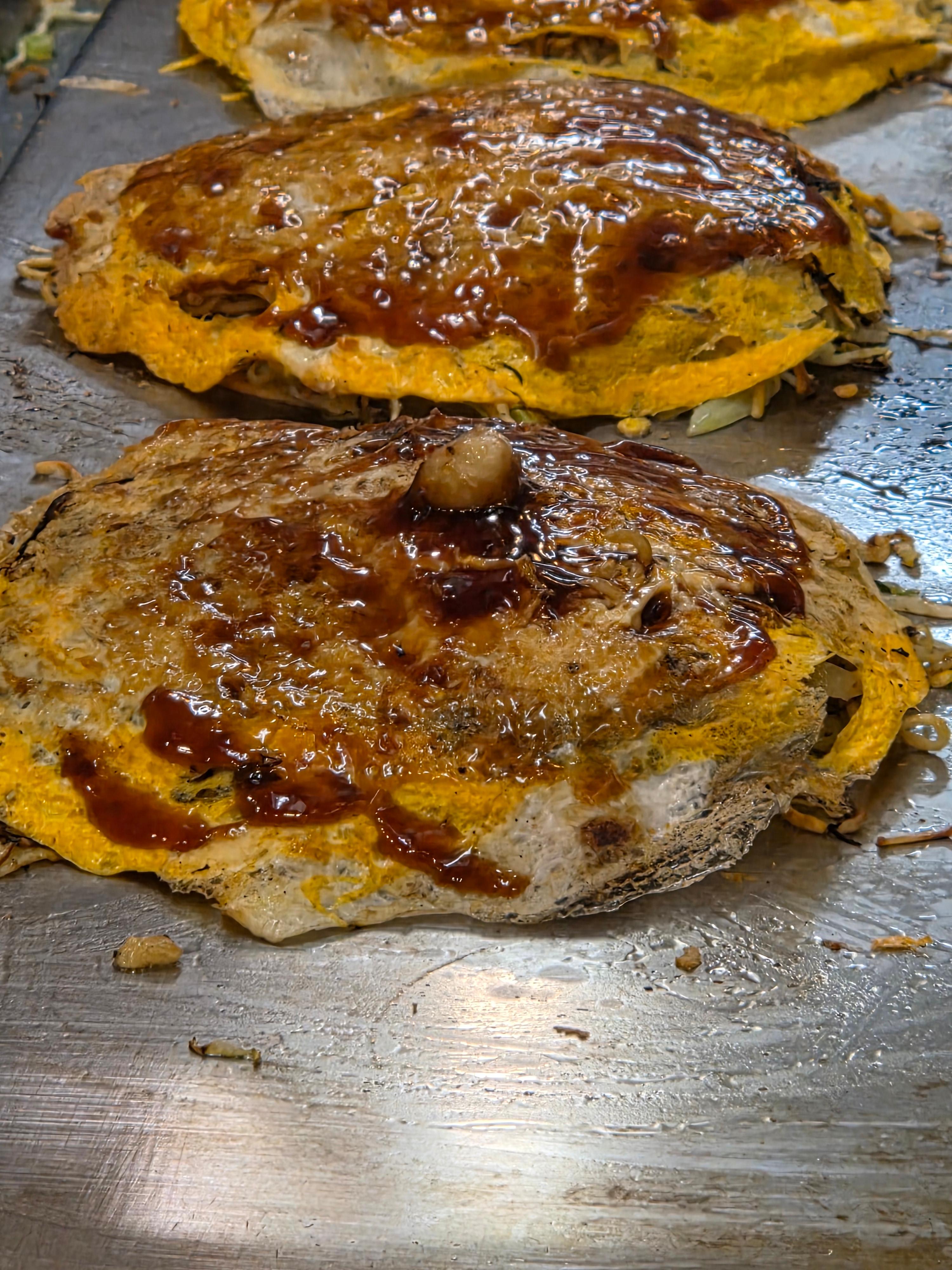 히로시마의 오코노미야끼가 특이한점은, 다른 지역의 오코노미야끼는 반죽 등을 한번에 다 해서 구워내는데 히로시마는 각각 따로 구워내서 합쳐서 먹는 방식이더라구요.